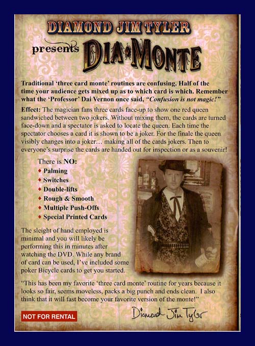 Dia-Monte ist eine Version des 3Card Monte (des Kümmelblättchens auf neuhochdeutsch), das ihre Zuschauer verrückt werden läßt, insbesondere dann, wenn Sie beginnen (scheinbar) zu erklären, wie die Sache funktioniert.