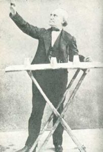 Robert-Houdin (1805-1871) bei der Vorführung des klassischen Bechertricks.