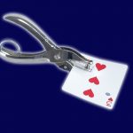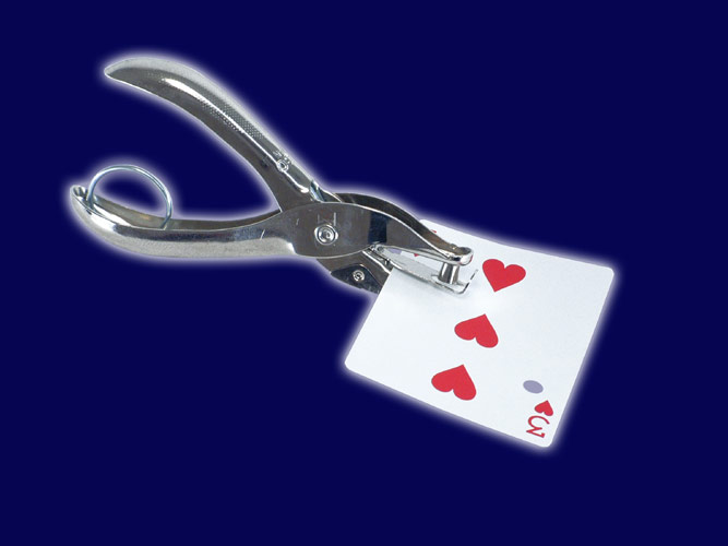 Sie lassen aus einem normalen Bicyclespiel eine Karte frei ziehen und unterschreiben. Dann nehmen Sie eine Lochzange und stanzen ein richtiges, echtes, rundes Loch in eben diese Karte.