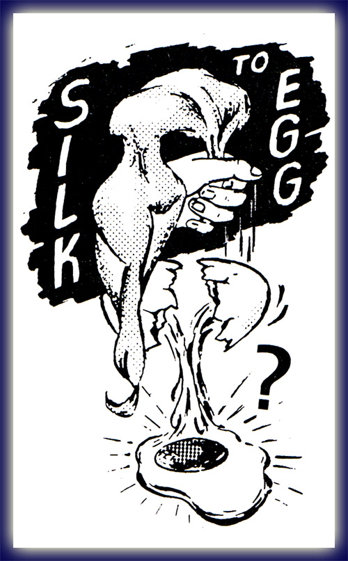 The performer pushes a colored silk into his closed left hand. When he opens his hand the silk is seen to have turned into an egg! Offering to “explain” the trick, the magician shows that the egg is hollow with a hole at one end. He pulls the silk out and displays the hollow egg. Again, he pushes the silk into the egg and shows how to cover the hole with his thumb. Then, he explains that someone might wish to question the egg, and in that case all you must do is break the egg on the rim of a glass and pour out the yolk and the white, which the magician does!