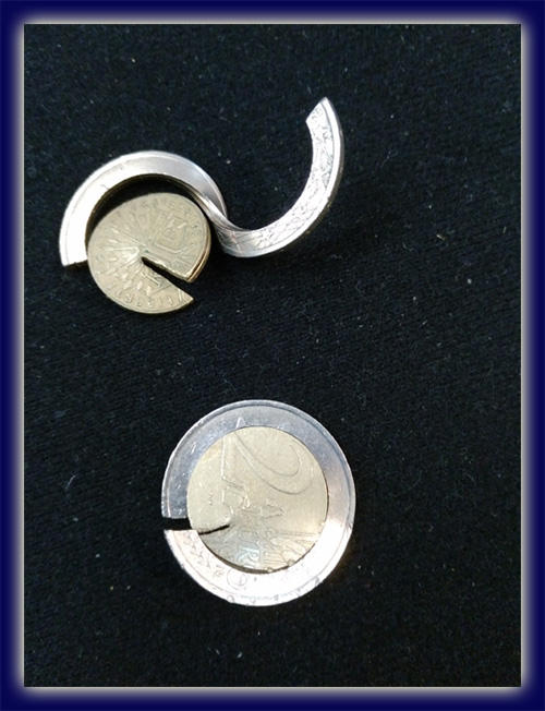 Sie zeigen eine Zweieuromünze vor, die Sie sofort mit den bloßen Fingern verbiegen. Danach reißen Sie die Münze an der Kante ein, nur, um sie schließlich vollkommen zu zerreißen, so dass das Endprodukt einem Korkenzieher ähnelt. Als Bonus gibt’s dann noch eine kleine goldene Scheibe: Das Mittelstück der Münze.