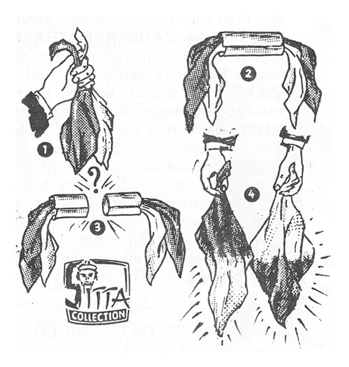 Wieder ein schöner Effekt aus der ZZM-Sitta Collection: Sie zeigen ein weißes und ein rotes Seidentuch vor. Beide Tücher stopfen Sie durch eine Pappröhre (oder wickeln Sie in einen Bogen Papier ein). Die Enden beider Tücher sind stets sichtbar.